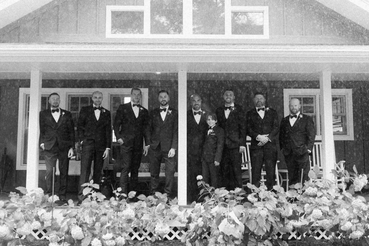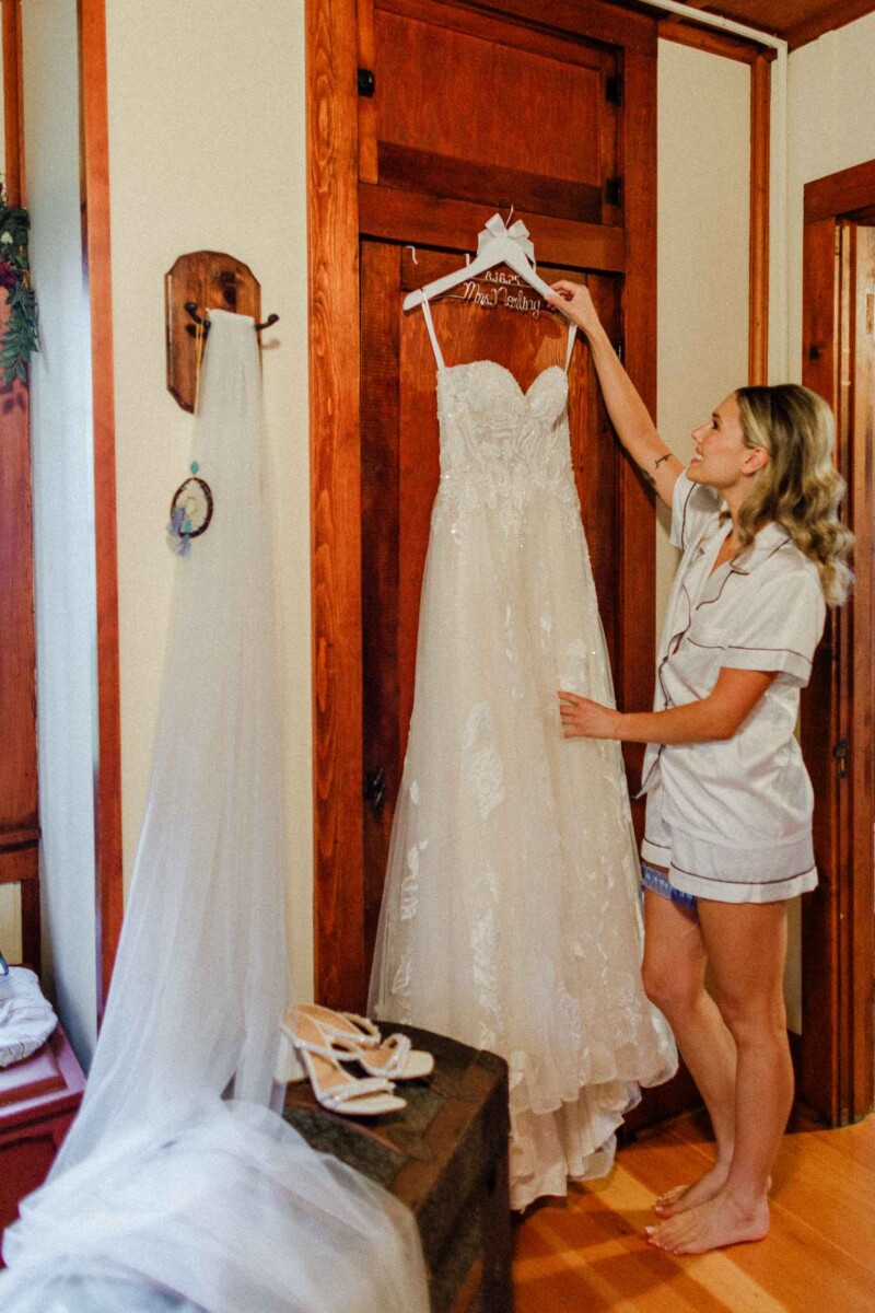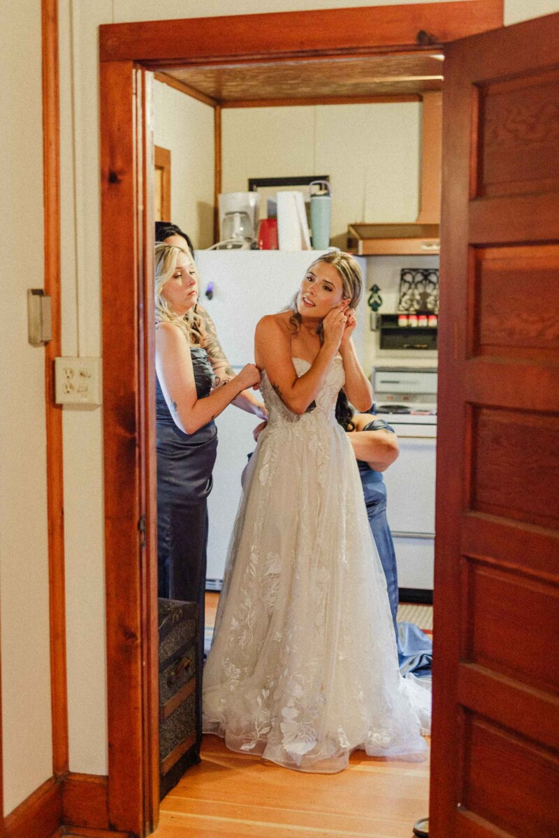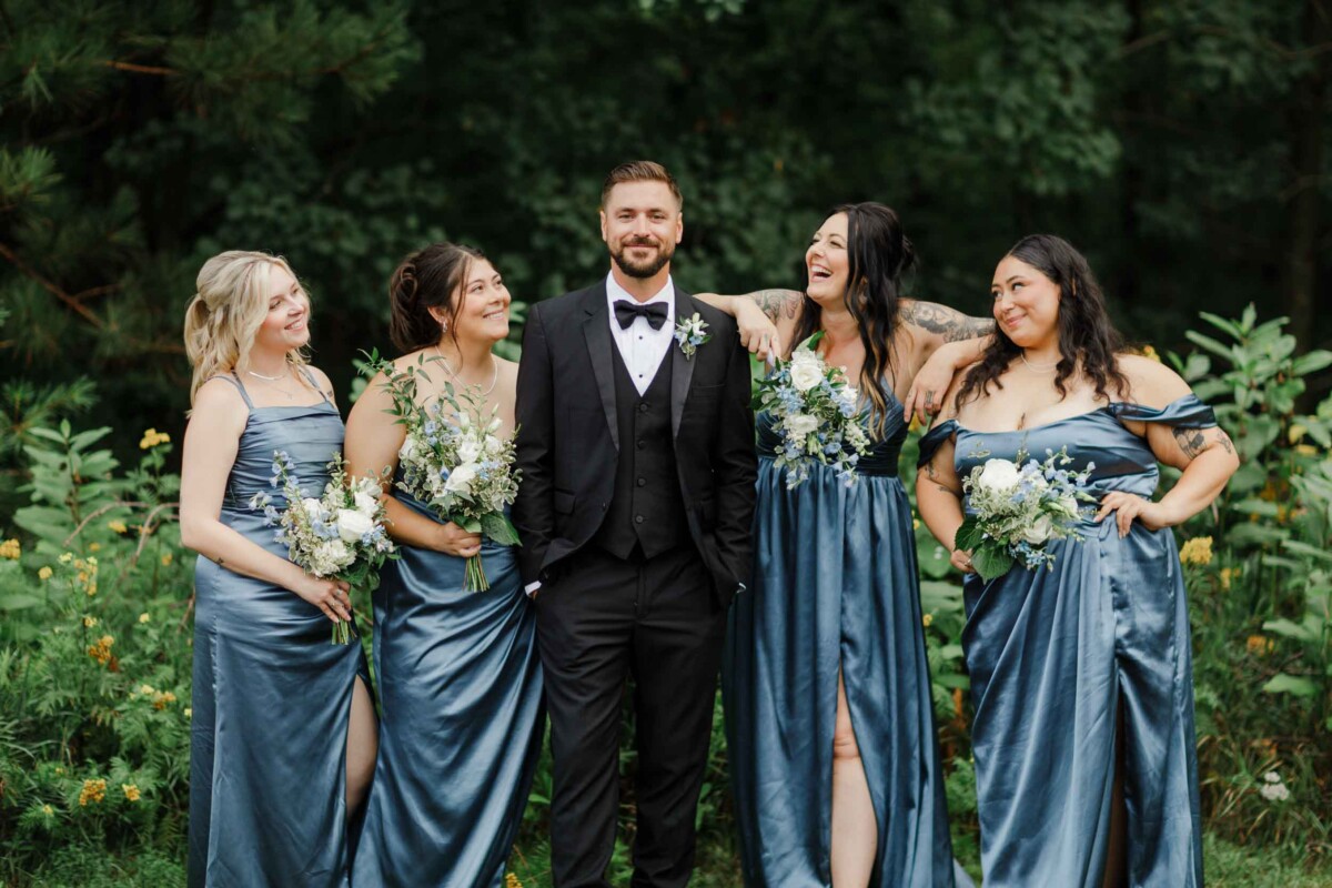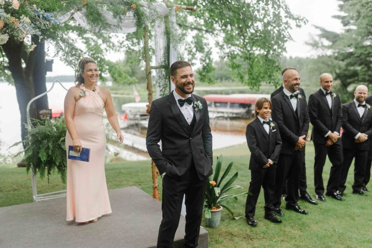 The morning unfolded quietly in two cabins—Gianna and her bridesmaids prepared at a cozy retreat on Plummer Lake Road, surrounded by the scent of pine trees and soft lake breezes. Details like her lace gown, heirloom jewelry, and hand-tied florals set a tone of understated elegance. Cody and his groomsmen, just down the road at the ceremony site on White Feather Lane, shared laughs while straightening ties and enjoying the calm before the vows.