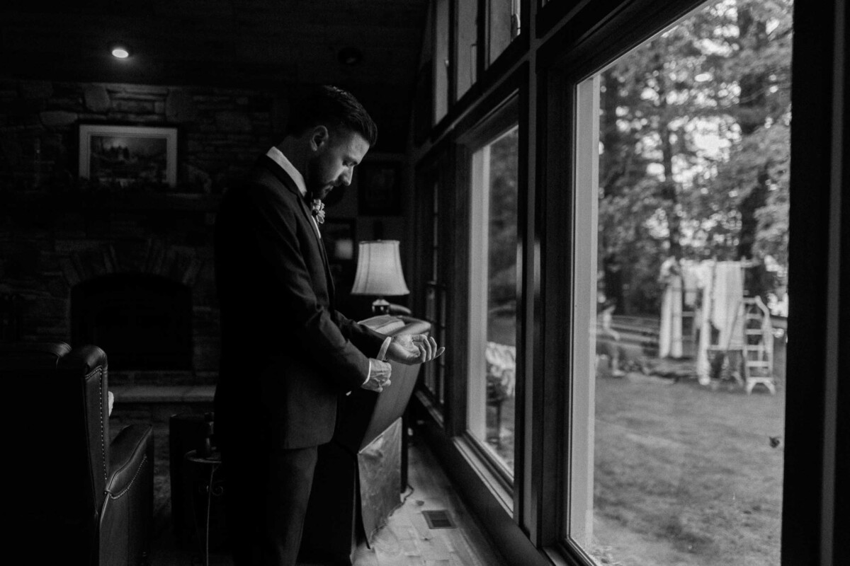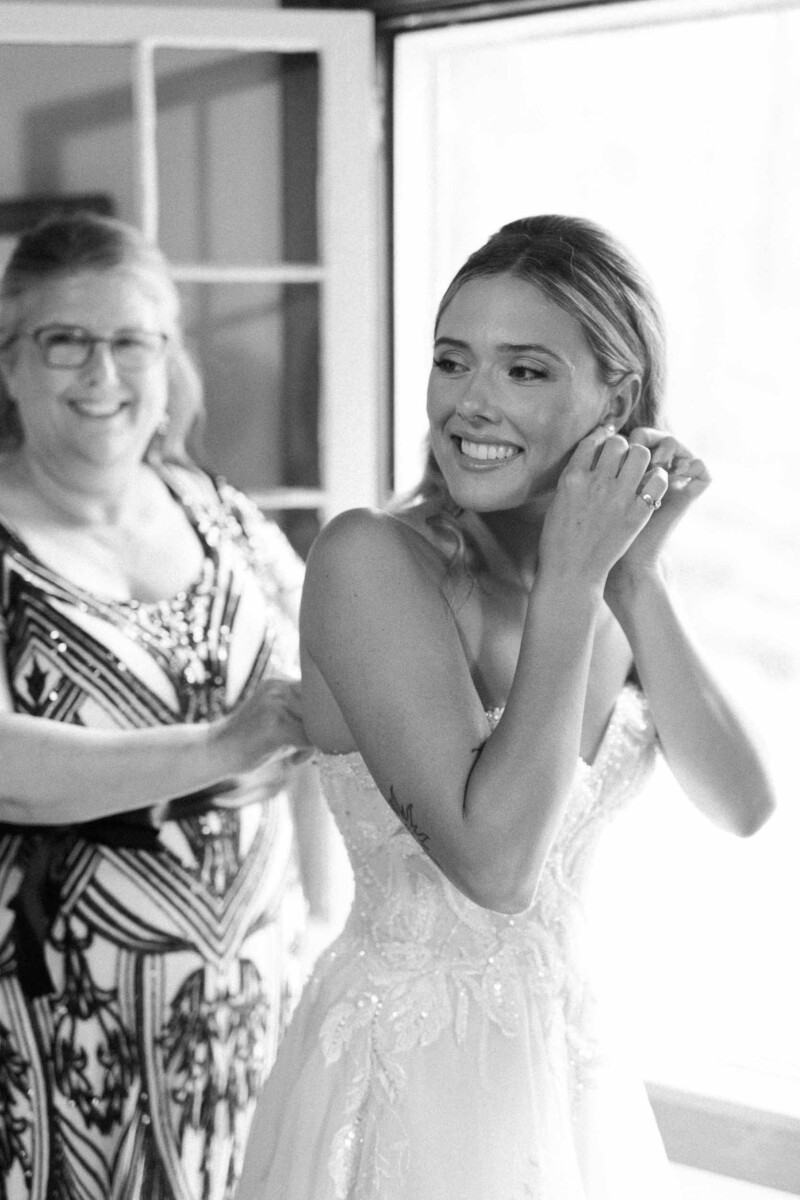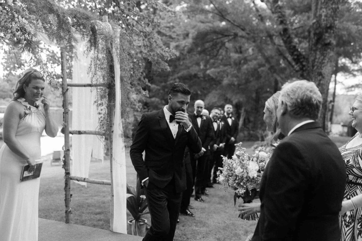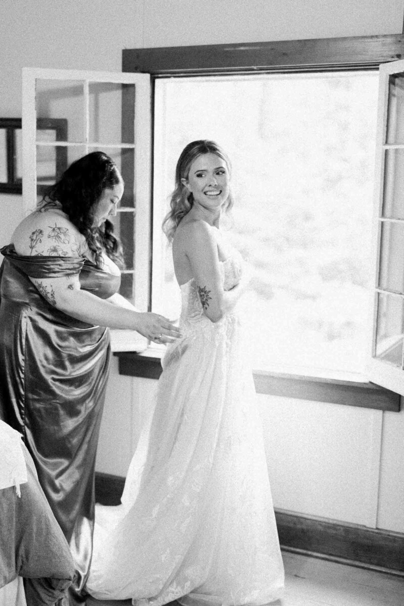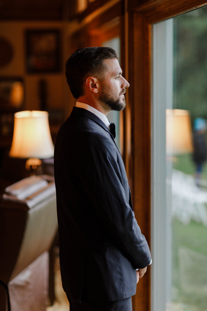 The morning unfolded quietly in two cabins—Gianna and her bridesmaids prepared at a cozy retreat on Plummer Lake Road, surrounded by the scent of pine trees and soft lake breezes. Details like her lace gown, heirloom jewelry, and hand-tied florals set a tone of understated elegance. Cody and his groomsmen, just down the road at the ceremony site on White Feather Lane, shared laughs while straightening ties and enjoying the calm before the vows.