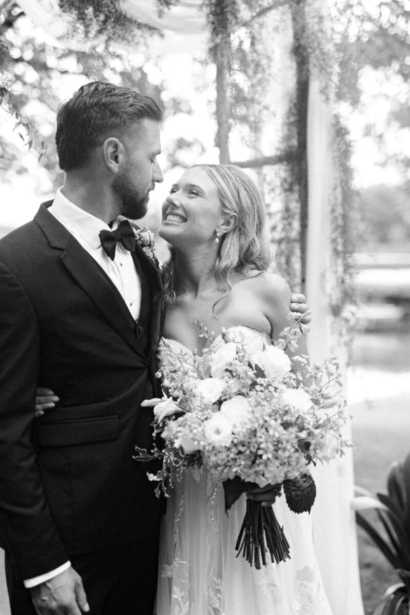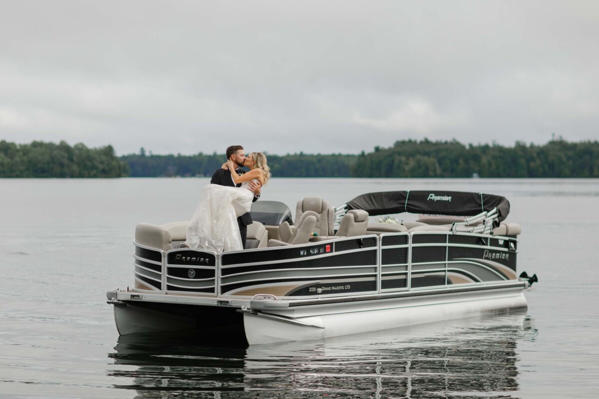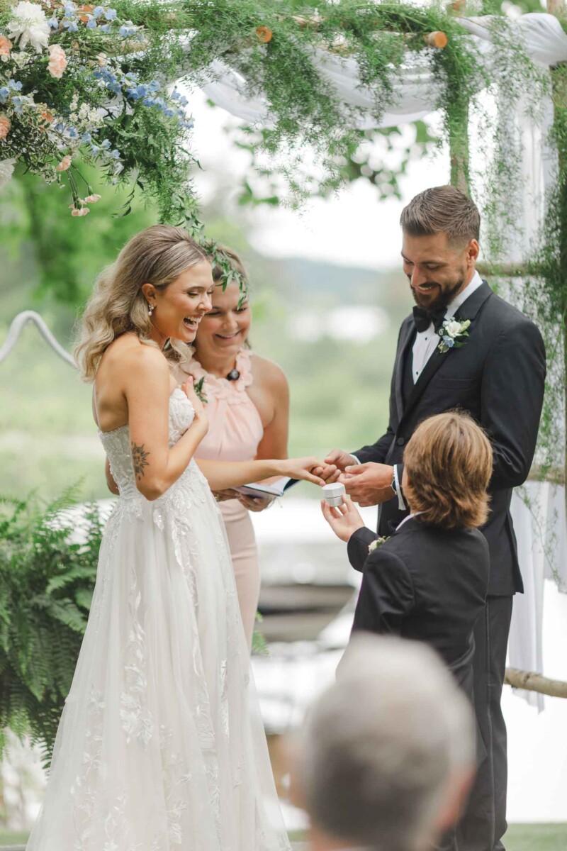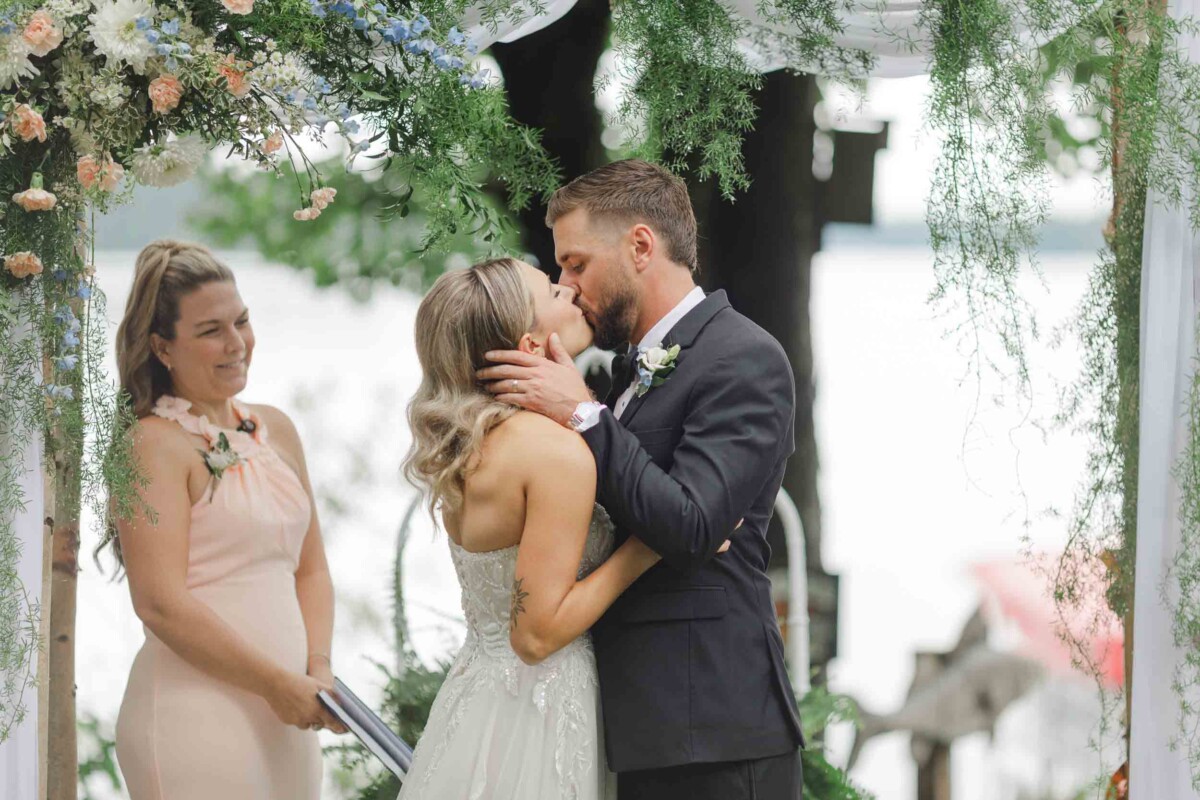 Guests gathered beneath a canopy of trees overlooking the lake, where Gianna and Cody exchanged vows in a heartfelt, 20-minute ceremony. The backdrop of sparkling water and a gentle breeze created a scene that was equal parts relaxed and romantic. The couple sealed their promises with a kiss, then boarded a small boat for a private post-ceremony ride—a unique and adventurous touch that fit their personalities perfectly.