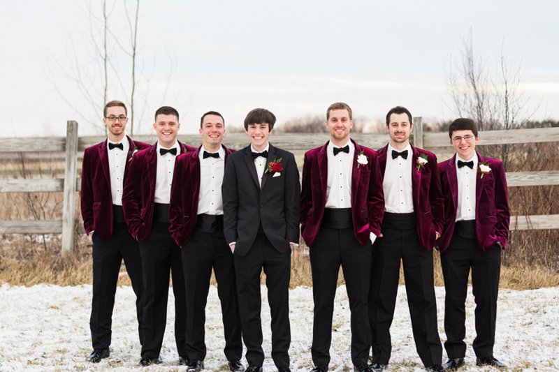 Winter Tux Fur Red Roses Red Bridesmaids Dresses Winter Wedding